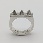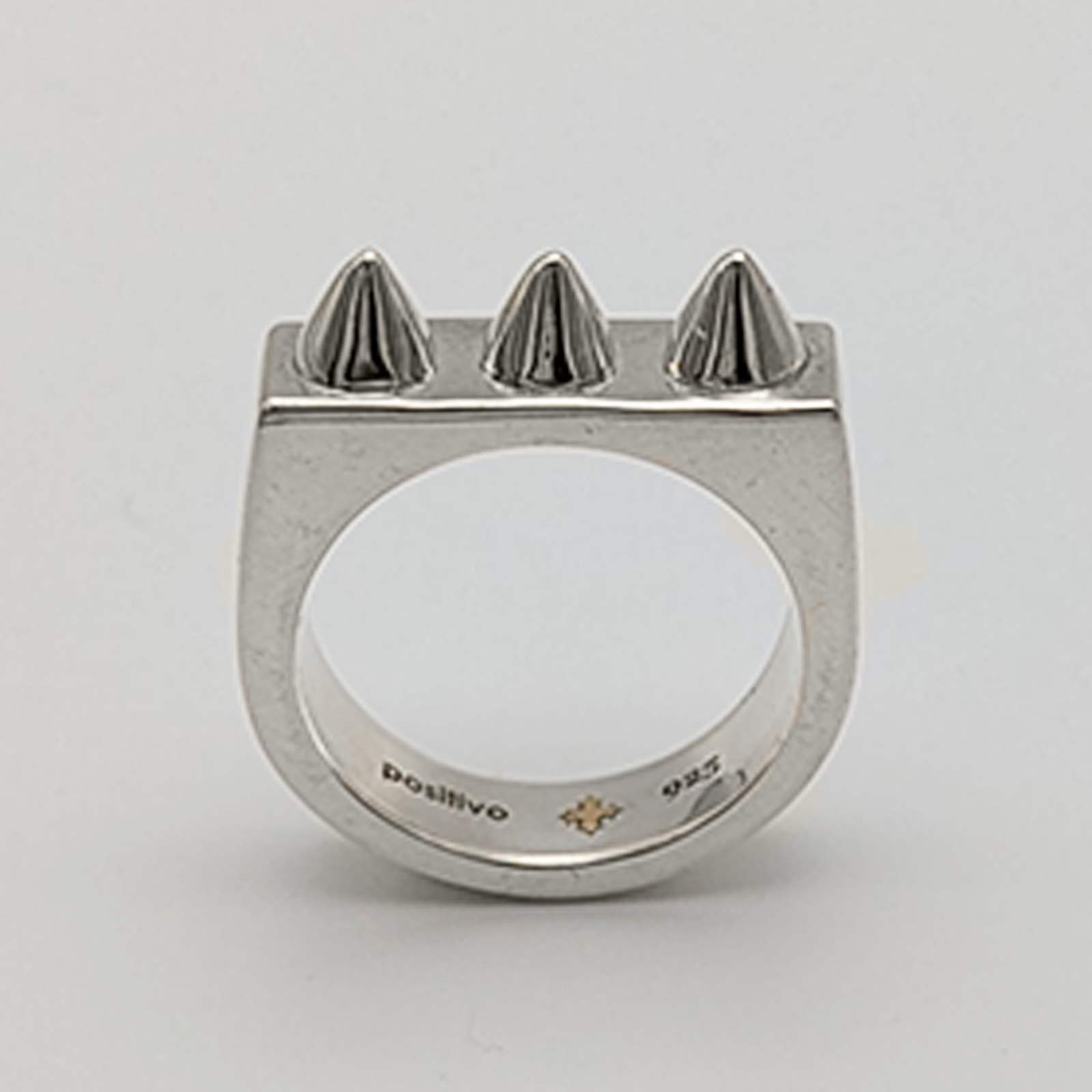This handmade one-finger ring spiked is constructed in 925 Sterling Silver with three spikes. It is a smooth, polished work of minimalist architecture. It measures approximately 6 mm wide and 20 mm long. Inside each positivo atelier piece, a small 18K Gold p sign is inlaid to remind you to be positivo.