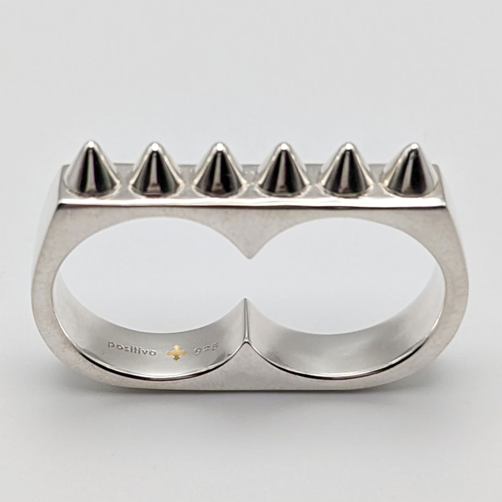 Sculptural, sleek, and unapologetically bold — the handmade 2-FINGER RING SPIKED by positivo redefines modern adornment. Forged from solid 925 Sterling Silver, this striking piece features six precision-formed spikes rising from a mirror-polished surface, creating a minimalist and architectural silhouette.