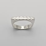 The unique p sign square band ring is handcrafted from 925 Sterling Silver. It features the signature positivo p sign motifs closely aligned 360 degrees. It is delicate, stackable, and suitable for everyone on all occasions.