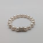 This classic handmade bracelet comprises 10 mm AAA quality freshwater pearls with ‘High’ luster. It features a beautiful signature positivo 925 Sterling Silver short barrel charm and flower charms between each pearl, all strung on stretch cord. It’s extraordinary.