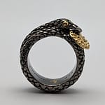 Sculpted with precision and intention, the positivo SERPENT RING is handcrafted in 925 Sterling Silver, finished in striking Black Rhodium, and accented with 18K Yellow Gold Vermeil. A lifelike serpent coils with purpose, sinking its fangs into the signature positivo “p mark” charm — a bold symbol of infinite hope and transformation.